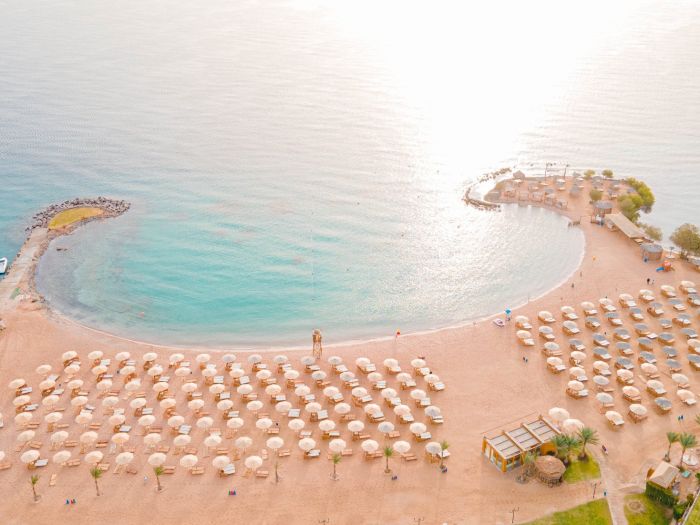 Собствен, пясъчен с кей. Чадъри, шезлонги и матраци на плажа и при басейна - безплатно. Плажни кърпи – безплатно.