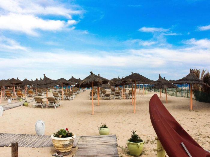 Собствен пясъчен плаж, на втора линия, на 650 м от хотела. Чадъри и шезлонги на плажа и басейна - безплатно.