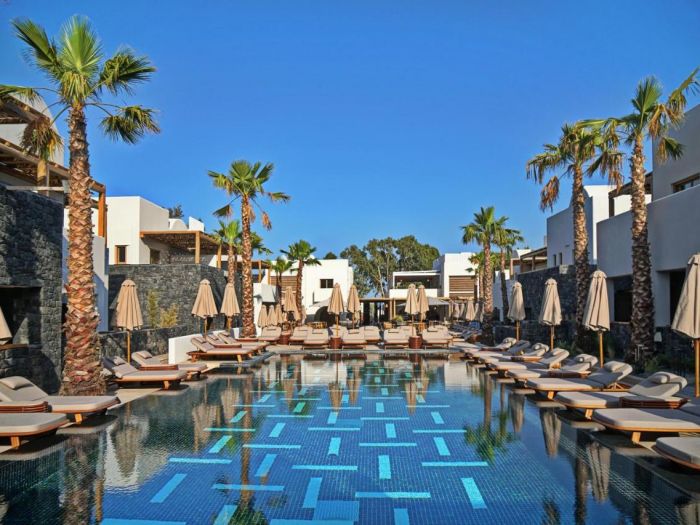 Премиум стая с тераса и самостояетелен плувен басейн - 26 кв.м. - Тази стая предлага извити елементи и минималистичен дизайн, вдъхновен от цикладската архитектура на острова и разполага с едно голямо или две единични легла, тераса със самостоятелен басейн и отлична гама от удобства в стаята, включително кафемашина Nespresso и телевизор.