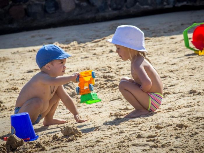 Собствен, пясъчен и лагуна. Чадъри, шезлонги и матраци на плажа и при басейна - безплатно. Плажни кърпи – срещу депозит.