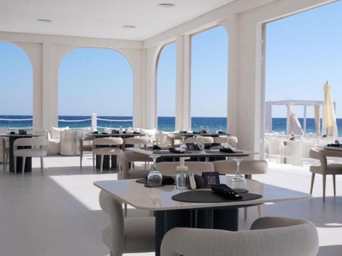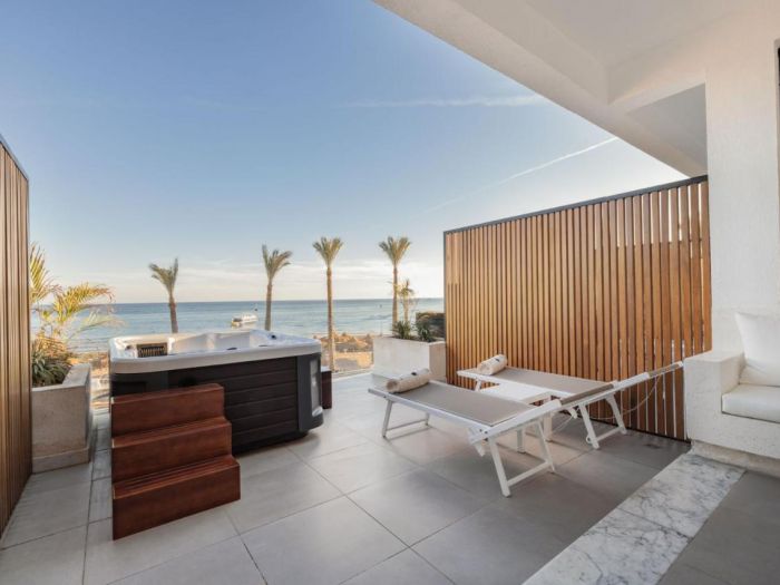 Собствен, пясъчен. Чадъри, шезлонги, матраци и плажни кърпи на плажа и при басейна - безплатно.
