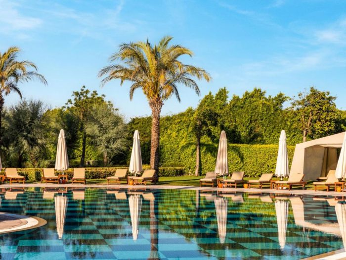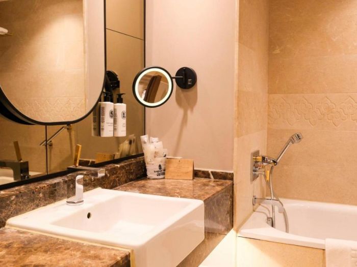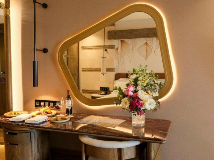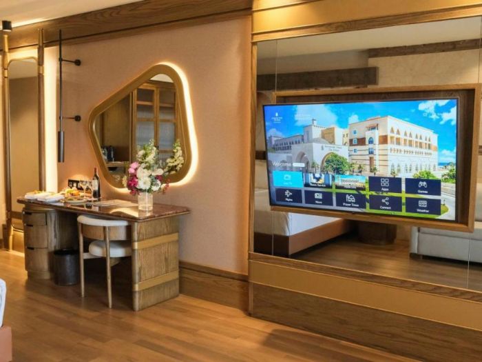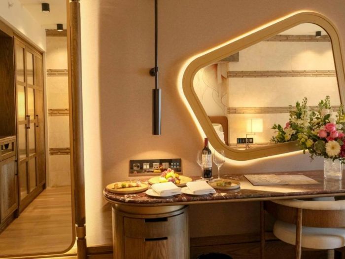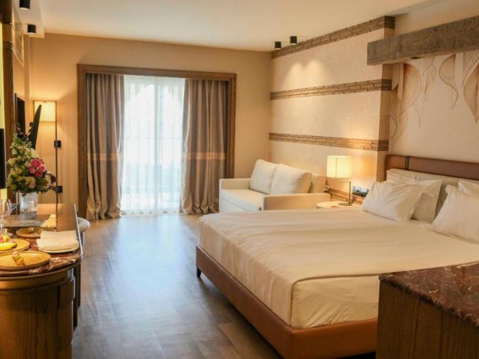 вана и душ,сешоар,везна,халат,чехли,централен климатик (Main building, регулира се от гостите на хотела),индивидуален климатик (villas,плазмен телевизор (може да се използва и като монитор за компютър – срещу допълнително заплащане),телефон,мини-бар (платено), сейф (в стаята, безплатно),под – паркет,балкон или тераса,почистване на стаите – ежедневно,смяна на спално бельо (по желание на гостите, ежедневно),room service (24 часа, платено),интернет (безжичен, кабелен, безплатно).