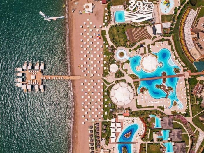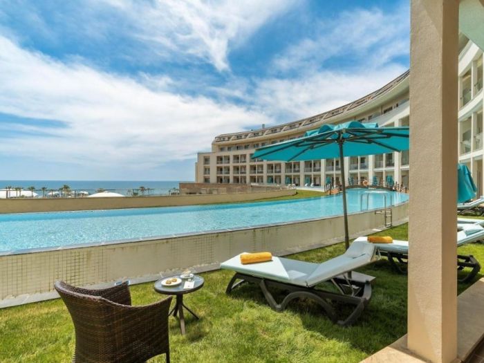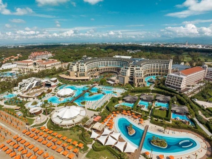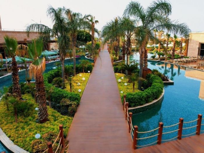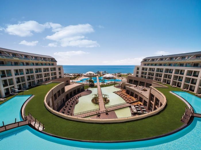 Разположение: Хотелът се намира на 27 км от летището в Анталия, на 35 км от центъра на града и на 2,5 км от селището Кадрие, на брега на морето. Построен е през 2013 г. върху територия с обща площ от 120 000 м2.