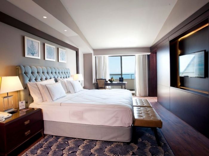 В стаите: Хотелът се състои от основна 5-етажна сграда и 13 едноетажни вили. Разполага с 506 стаи, с изглед към морето, басейна и градината. Стаите са оборудвани с централна климатизация, телевизор, избор на възглавници, халат и чехли, мини-бар безплатно (безалкохолни напитки, шоколад, бира - ежедневно зареждане), високоскоростен безжичен интернет, електронен сейф, телефон с директно избиране, сешоар, баня с душ/ вана, комплект за чай / кафе, балкон / тераса, под - ламинат. Почистване на стаите - ежедневно, смяна на спално бельо - 3 пъти седмично.