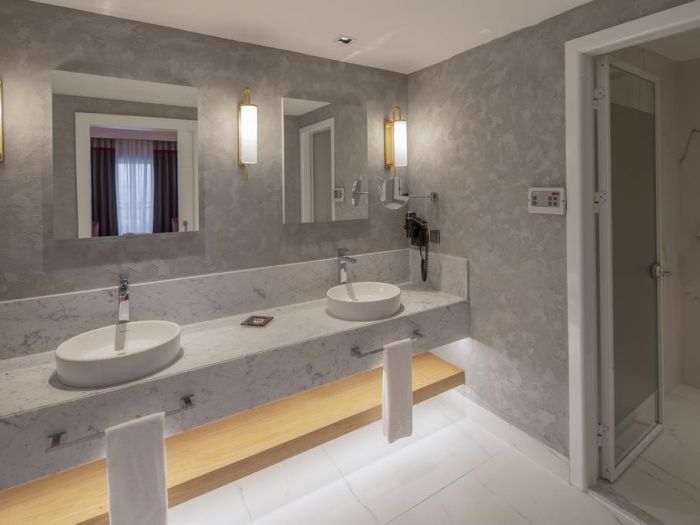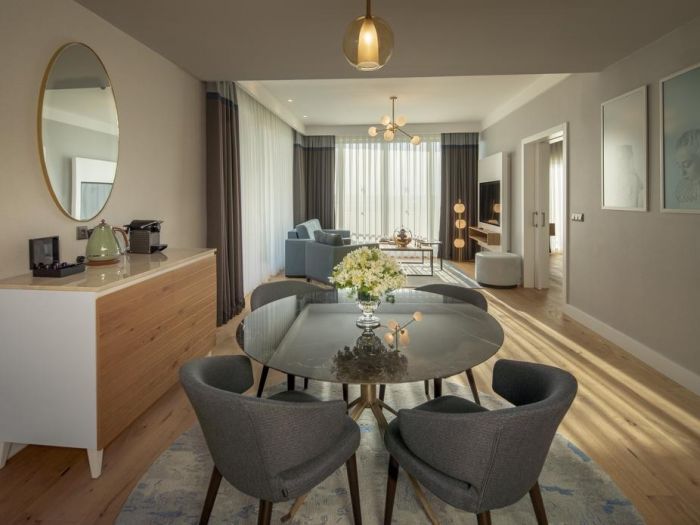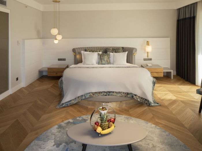 Стаи Main building: 74 Deluxe Room with Partial Sea View (частичен изглед море - 38м2), 84 Deluxe Room with Partial Sea and Pool View (частичен изглед море и басейн - 38м2), 36 Deluxe Room with Sea View (изглед море - 48 м2), 16 Corner Suite with Jacuzzi & Sea View (спалня, баня, тераса с джакузи - 48 м2), 4 Designer Suite (спалня и хол разделени с врата, баня, кафе Nespresso, тераса с джакузи - 68 м2), 3 Grand Designer Suite (изглед море, спалня и хол разделени с плъзгаща врата, 2 бани, кафе Nespresso, тераса с джакузи - 106 м2), 3 Designer Suite 360 (спалня с кръгло легло, баня, кафе Nespresso, тераса с джакузи - 55 м2).