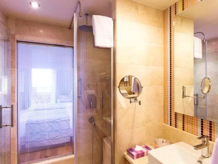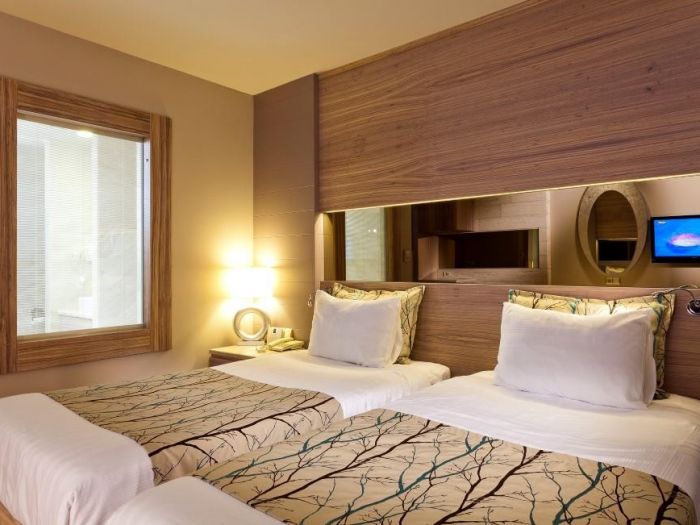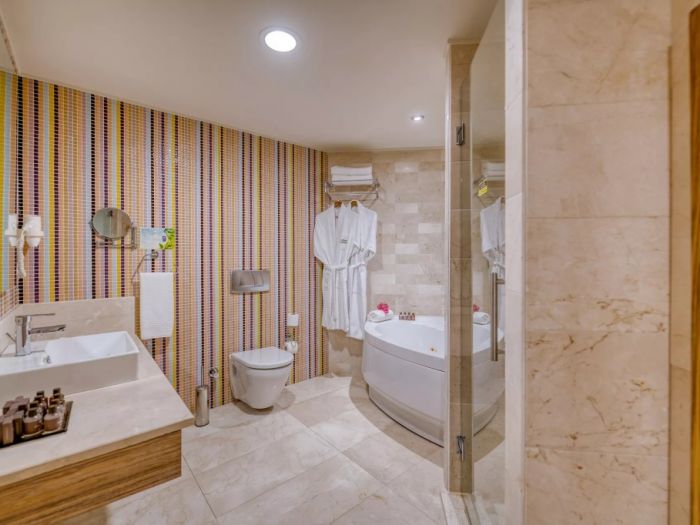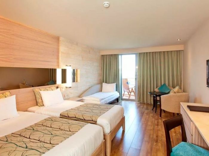 В стаите: Състои се от една основна 9 етажна сграда, оборудвана с 6 асансьора и общо 303 стаи:Suit room, Terrace room, Gardenview room, Lateral seaview room, Seaview room, Family room. В стаята има централен климатик, телевизор, телефон, баня с душ, сешоар, мини бар (вода, безалкохолни напитки и бира - зареждат се 3 пъти седмично, безплатно), сейф (безплатно), балкон, сет за кафе и чай, под - ламинат.