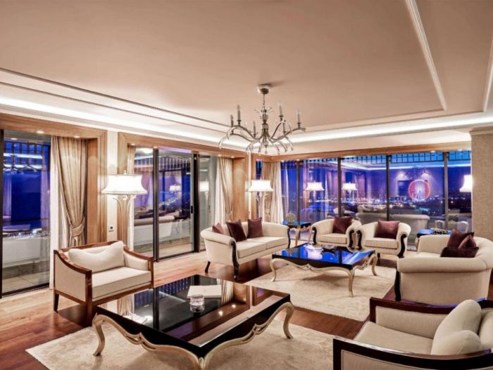 Роял суит с 1 хол и 2 спални с площ 128 м2 предлага няколко жилищни помещения. Апартамента се отличава с най-високи нива на лукс и 2 бани. Свързване към Интернет и 3 LCD телевизора, гарантират комфортен престой в хотел Rixos.