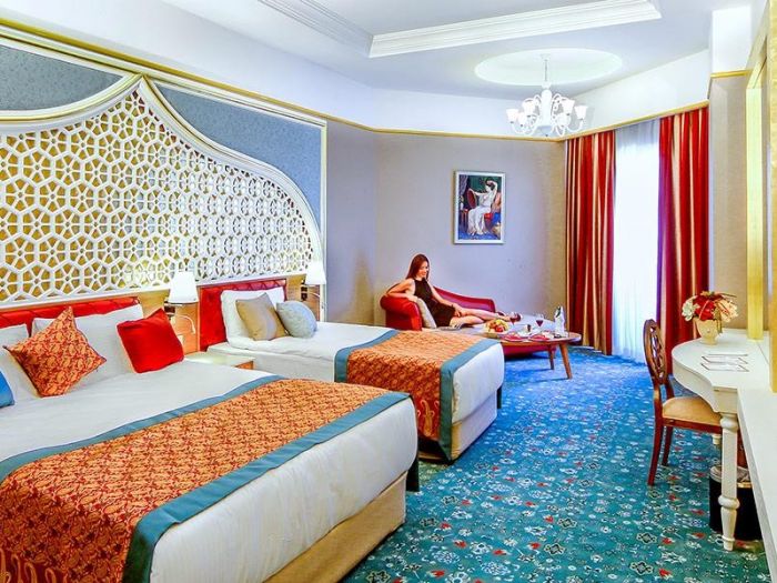 В стаите: Хотелът разполага с общо 450 стаи, от които 356 стандартни стаи и 68 фамилни стаи. Всички стаи са оборудвани с: климатик, сателитна телевизия, телефон, баня с вана, сешоар, минибар - зарежда се един път в деня с вода и бира - безплатно, сейф (безплатно), балкон. Почистване на стаите и смяна на кърпите – всеки ден, смяна на бельото – 2 пъти в седмицата.
