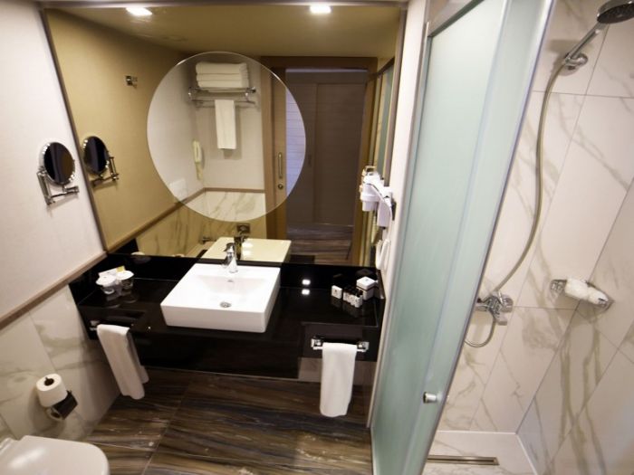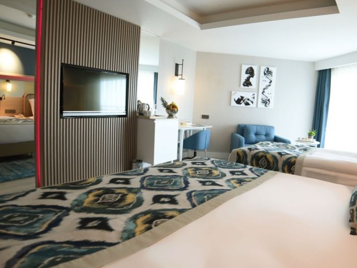 В стаите: Хотелът разполага с общо 457 стаи. Стаите разполагат с централна климатизация (отворена в определени часове, в зависимост от метеорологичните условия), мини-бар (вода, безалкохолни напитки и бира - презарежда се ежедневно), сателитна телевизия, телефон с директно избиране, баня с душ, сешоар, сейф, халати (такса), чехли (безплатно), кана, комплект за чай и кафе, меню за възглавници (срещу заплащане), мека мебел, бюро, балкон, WI-FI, под - ламинат. Почистване на стаите - ежедневно, смяна на спално бельо - 3 пъти седмично.
