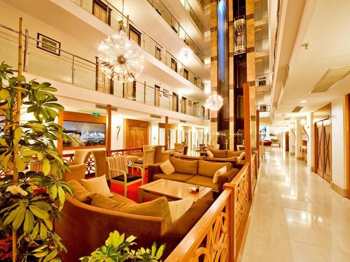 В стаите: Хотелът се състои от 240 стаи. Всички стаи са оборудвани с: вана, сешоар, централен климатик, телефон, телевизор, мини бар (вода – зареждане всеки ден, безплатно), балкон, сейф (платено), балкон. Почистване на стаята – всеки ден, смяна на спалното бельо – 3 пъти седмично.