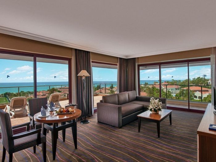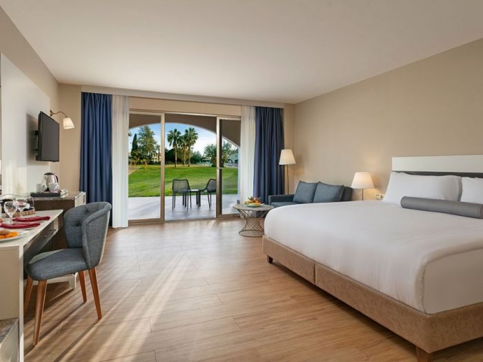 Стаи Main Building: Standard Junior Suite With Garden View (с изглед градина – 47 м2), Standard Junior Suite With Sea View (с изглед море - 47 м2), Duplex Family Suite (2 спални разположени на 2 етажа, 2 бани, изглед към голф игрище или градина - 80 м2), Terrace Suite (спалня, 2 бани, тераса с шезлонги, изглед море - 95 м2), Family Suite (2 спални, 2 бани, тераса с шезлонги, изглед море 95 м2).