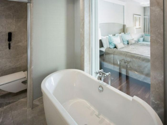 82 кв.м Corner Suites в основната сграда с 2 спални (френско и единични легла), баня с душ и WC. С възможност за изглед към басейн, река или градина. Стилни и удобни.
