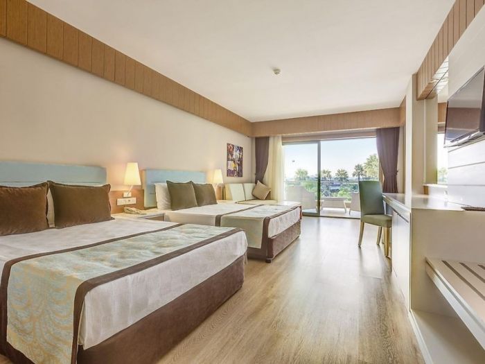 В стаите: Хотелът се състои от 6 етажна основна сграда + 29 бунгала и разполага със 774 стаи. Стаите са оборудвани с индивидуален климатик, LCD-телевизор, телефон, душ, сешоар, минибар (зареден при настаняване с вода и безалкохолни напитки), сейф, набор за приготвяне на чай и кафе, балкон, Wi-Fi (безплатно), под - ламинат. Почистване на стаите – ежедневно, смяна на спално бельо - 3 пъти седмично.