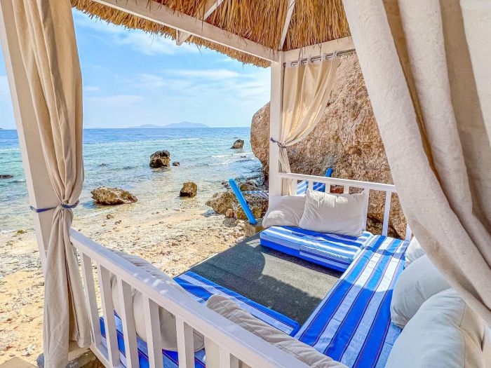 Собствен, пясъчен и коралов, с дължина 700 метра, кей. Чадъри, шезлонги и плажни кърпи на плажа и при басейна – безплатно.