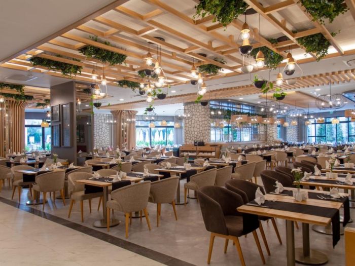 Основен ресторант, 2 а-ла-карт ресторанта (средиземноморски, китайски – 1 безплатно посещение на 1 от ресторантите при минимум 7 нощувки, с предварителна резервация), 1 снек ресторант на плажа, сладкарница, 3 бара, открит и закрит басейн, аквапарк с 4 водни пързалки, СПА център.