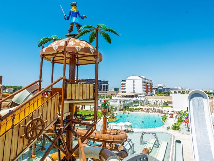 За децата: Детско меню, детски басейн, водни пързалки за деца, детска площадка, мини клуб (4-12г), гейм център, мини диско, детско кино, детска анимация, бебе пакет (кошара, бебешка вана, гърне, седалка за тоалетна, кана за гореща вода - с предварителна заявка), бебе бюфет (адаптирано мляко, пастьоризирано мялко, биберон, мокри кърпи, столче за хранене, нагревател за бутилки, стерилизатор - безплатно), детска количка (под наем).