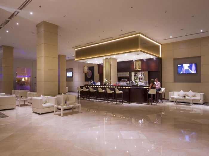 Основен ресторант, 7 а ла карт ресторанта (италиански, барбекю, египетски, азиатски, диетичен, стек, морски-платен), 8 бара, 6 басейна, дневна и вечерна анимация, амфитеатър, банкомат, магазини, аква парк с 6 водни пързалки, денонощна рецепция, асансьор в основната сграда, СПА център, конферентна зала, анимация, жива музика.