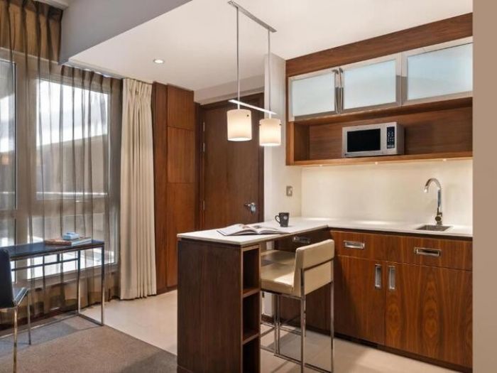 Най-просторното помещение предлага апартаментен стил с кухненски бокс, трапезария и отделна дневна зона. Легло Queen и умни технологии осигуряват комфорт за релаксация, работа или по-дълъг престой.