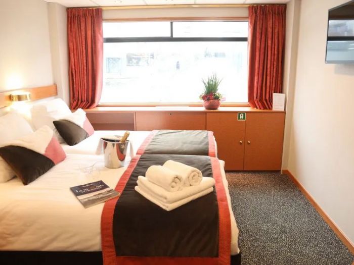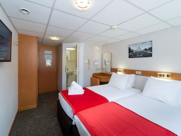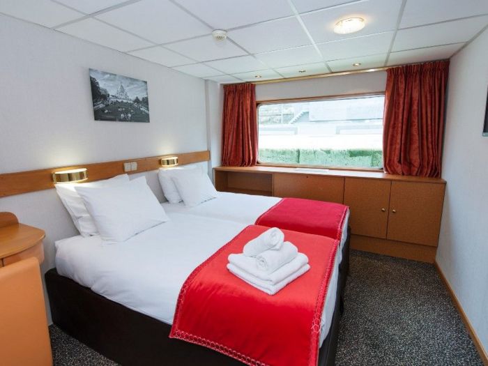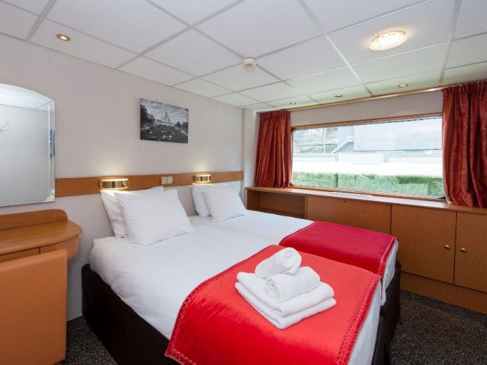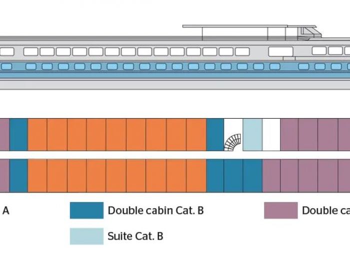 Каютите са общо 67, разпределени на 2 палуби, с площ около 12.50 кв. м. На основната има общо 43 каюти с прозорец. На горната палуба се намират 24 кабини с отварящи се в горната част (плъзгащи) прозорци.
