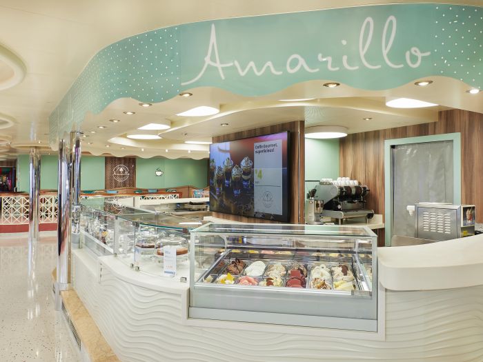 Ceres и Vesta са двата основни ресторанта за закуска, обяд и вечеря. Отделно бюфет ресторанта предлага голям избор от ястия на самообслужване. На борда ще намерите още La Fiorentina – класически стекхаус и Sushino – японски суши ресторант. Вкусни италиански сладоледи ви очакват в Джелатерия Amarillo.