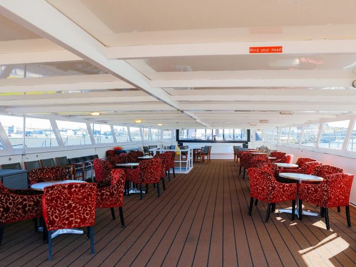 На разположение на гостите са ресторант, бар, зона с камина и кресла, машина за кафе и чай на самообслужване през целия ден, библиотека, сауна и фитнес, слънчева тераса със шезлонги, безжичен интернет срещу заплащане. Корабът разполага с 3 палуби, капацитетът е 110 гости.