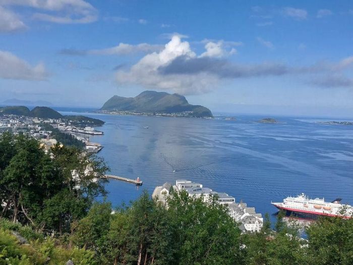 Градът е създаден през 1793 г. и е едно от важните норвежки пристанища. Претърпявайки пожар в началото на 20 век, той се ражда отново в модерния за времето си стил Ар Нуво, което го превръща в истински музей на открито. Обиколката на града ще ни запознае с историческото му минало и запазените красиви фасади. Ако обичате планинските преходи, може да се включите в 300-метрово изкачване на близката планина Шугартоп, от която се открива прекрасна гледка към Боргунд фиорд. Ние ви предлагаме 70-минутна обиколка с туристическо влакче, която започва от круизния терминал и ще ни доведе до върха на Аксла, откъдето се открива гледка към целия залив.