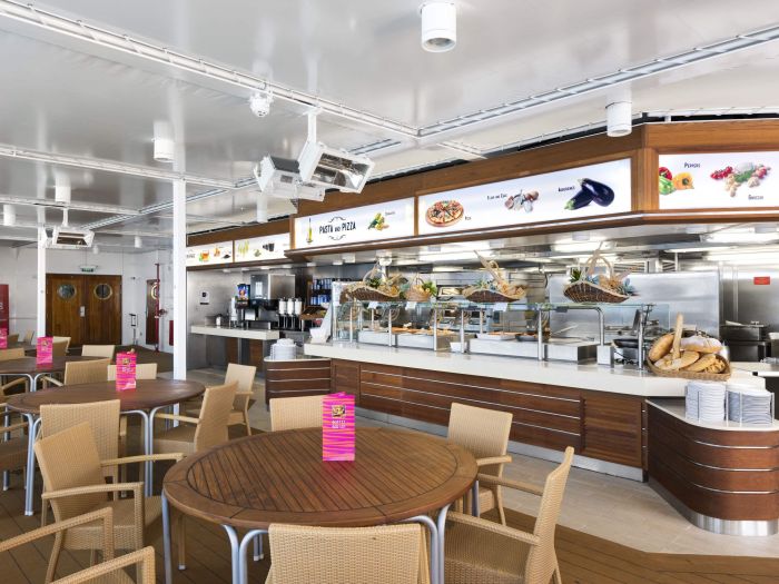 Два основни ресторанта L`Approdo и La Caravela и бюфет, включени в цената на круиза, грил, пица и паста бар.