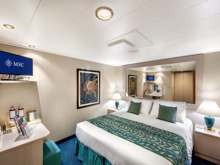 Суити, каюти с балкон, каюти с прозорец /не се отваря/, вътрешни каюти, каюти за инвалиди. Всички със сателитна ТВ, телефон, сейф, сешоар, климатик, минибар, интернет и рум сървиз срещу заплащане. Повечето разполагат с диван, който се превръща в трето легло или 2 легла една над друго за настаняване на 2 деца.