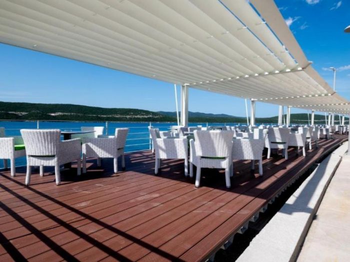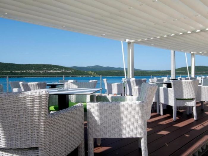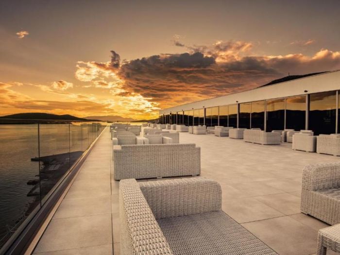 Тераса с прекрасна гледка към морето, където гостите могат да се насладят на напитки или просто да релаксират.