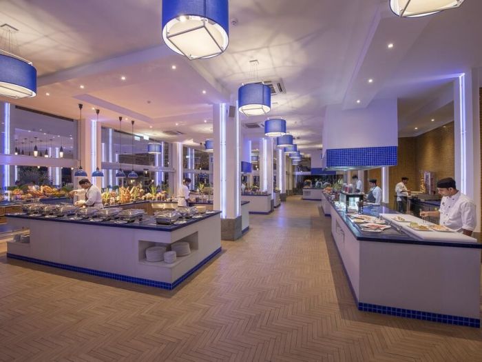 На територията: На териториата на хотела има 4 ресторанта(Азиатска, средиземноморска, японска, италианска, централна и южноамериканска кухня), барове/ бар, бар до басейна, бар на плажа/, семейни стаи, спа център, фитнес, възможности за различни водни спортове,тенис кортове, мини фyтболно игрище и детски клуб.