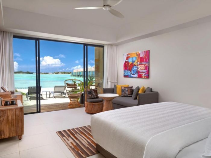 Площ 75 кв.м., с king size легло или две двойни легла, подходяща за 3-ма гости – Platinum Overwater Villa предлага частна тераса с шезлонги, мрежа за отдих над водата и директен достъп до тюркоазената лагуна.