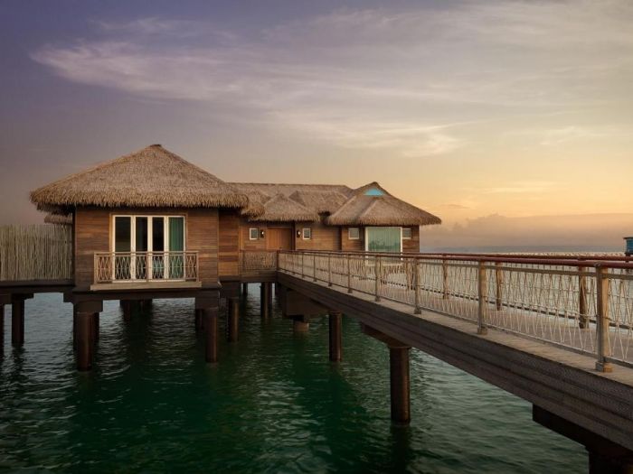 Плаваща вила – убежище с гледка към океана и силуета на Доха, с два спални с легло king и една с две единични легла, всяка със собствена баня. Прекарвайте деня плувайки или почивайки в прохладна кабана. 220 м², максимум 6 възрастни, легла king.