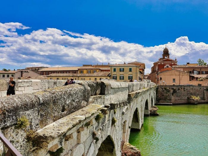 Пешеходна разходка в историческия център на Римини. Разглеждане на Арката на Октавиан Август,Старата часовникова кула, катедралната църква „Малатеста”, изграденa в средата на 15 в. като погребална църква на управляващата фамилия Малатеста,