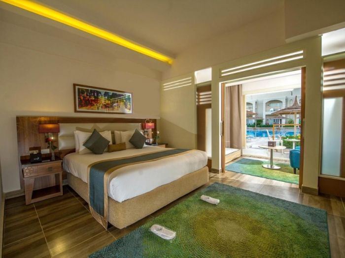 В стаите: Хотелът разполага с 330 стаи, от които 100 Standard Rooms (45 кв.м.), 194 family rooms с двуетажно легло (45 кв.м.), 8 suites и 1 royal villa. Всички стаи са оборудвани с климатик, телевизор, телефон, баня с вана/душ, сешоар, сейф, мини бар, кана за кафе и чай, Wi-Fi, балкон или тераса. Почистване на стаите - ежедневно.