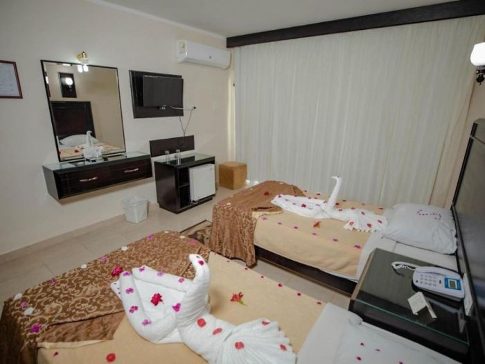 В стаите: Хотелът разполага с общо 144 стаи. Хотелът се състои от основна 3-етажна сграда, два 2-етажни корпуса и две 2-етажни бунгала. Всички стаи са оборудвани с климатик, телевизор, телефон, баня с душ, сешоар, минибар (платен), сейф, балкон/тераса. Почистване на стаите и смяна на кърпи - всеки ден, смяна на спално бельо - 3 пъти седмично.