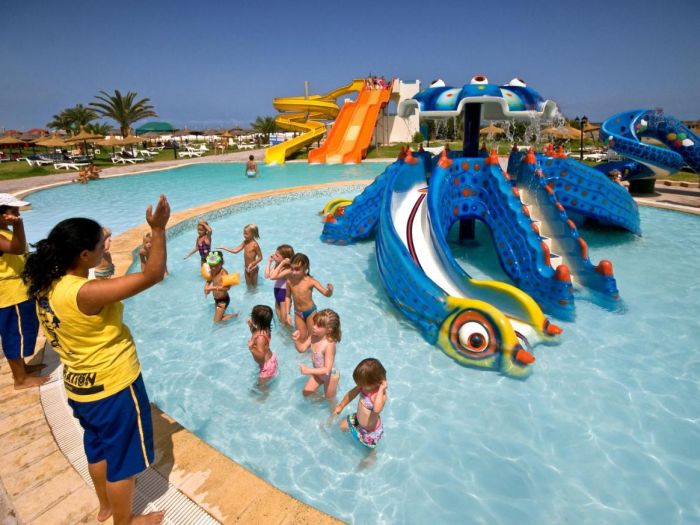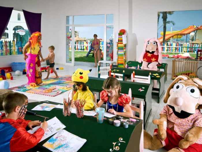За децата: детски басейн с мини пързалки, втори детски басейн, детска площадка, мини клуб (4 -12 год.) д), бебешка кошара (безплатно, след предварителна заявка, според наличността), детски столчета в ресторантите.