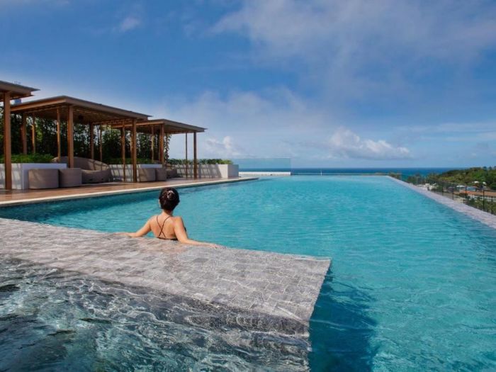 GRANDE DELUXE OCEAN VIEW WITH PLUNGE POOL - площ от 77 м2, гледка към океана, подходящи за двама възрастни и едно дете. Модерна и луксозна стая с панорамна гледка към океана, включваща частен басейн. Разполага с едно голямо двойно легло king size, и отделна дневна с диван разделена с плъзгаща врата. Стаята е оборудвана с 32-инчов телевизор с плосък екран, безплатен безжичен интернет, индивидуален климатик, безплатен сет за приготвяне на чай и кафе, минибар, сешоар, тоалетни принадлежности, самостоятелна баня с душ.