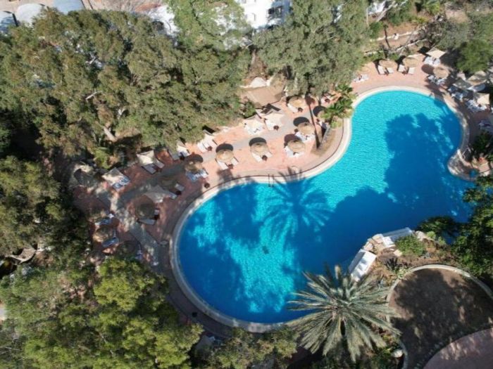 - Открит басейн с шезлонги и чадъри