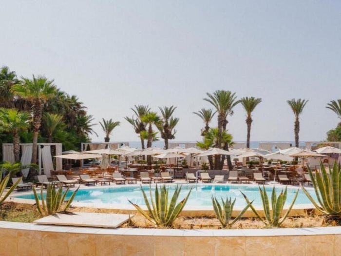 - Открит басейн с шезлонги и чадъри