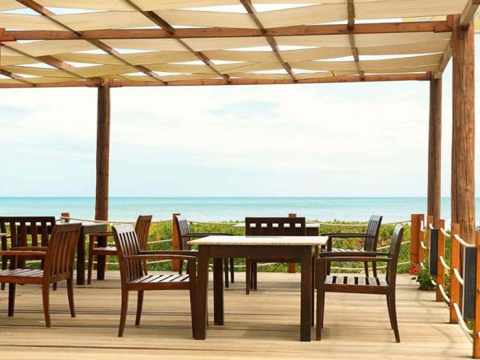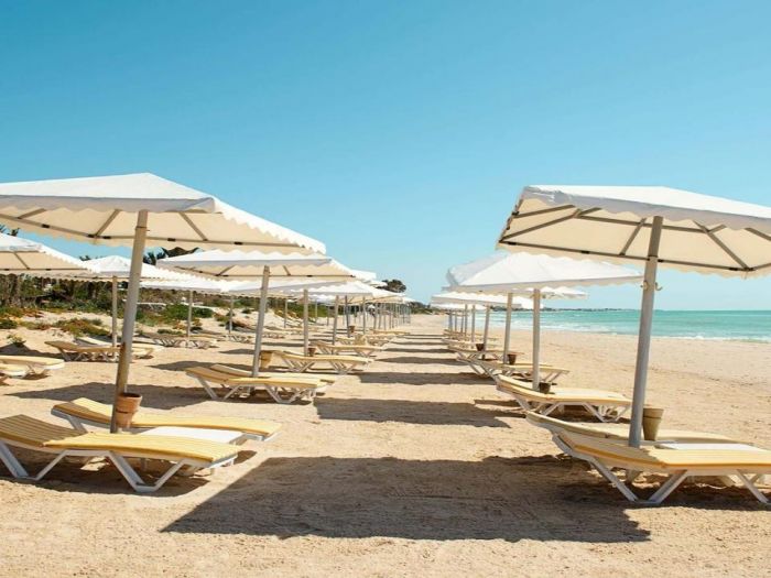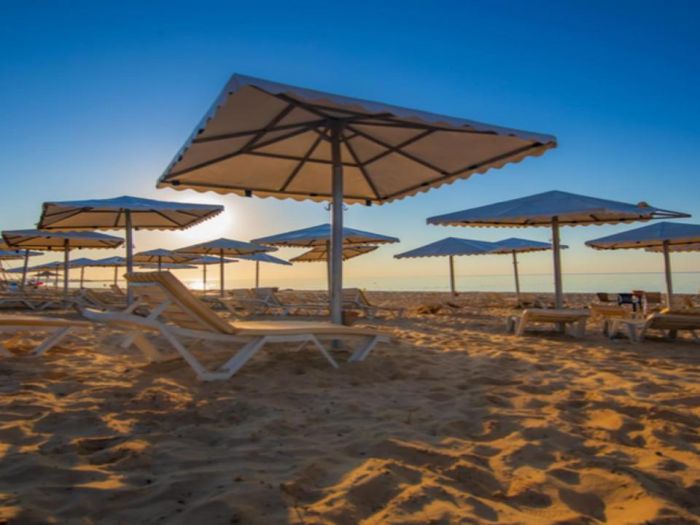 - Шезлонги и чадъри около басейна и на плажа