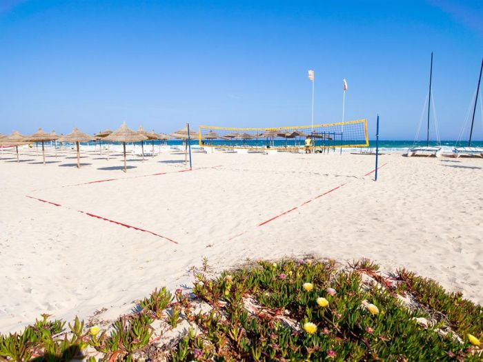 Частен пясъчен плаж, втора лини. Чадъри и шезлонги на плажа и басейна - бесейна. Плажни кърпи - срещу заплащане и срещу депозит.