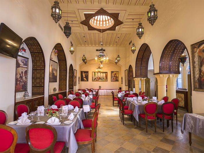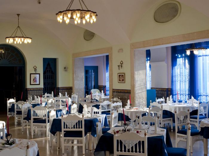 Основен ресторант Le Tunisien, 4 тематични а ла карт ресторанта, всеки от които може да бъде посетен безплатно веднъж по време на престой след предварителна резервация (в хотел Medina Belisaire & Thalasso със средиземноморска кухня, в хотел Medina Diar Lemdina с мароканска кухня, в хотел Medina Solaria & Thalasso с италианска кухня, в ресторант Shaherezade” в хотел Medina Diar Lemdina с тематична вечеря 1001 нощи), снек бар, бар басейн, лоби бар, плажен бар, мавританско кафене (срещу заплащане), 2 открити басейна, 1 закрит басейн (от ноември до април), денонощна рецепция, конгресен център, СПА център, обмяна на валута, анимация.