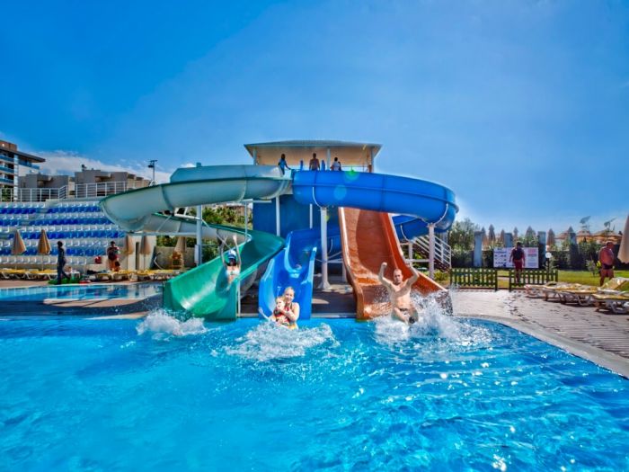Основен ресторант, а - ла - карт ресторант, 4 бара, 4 открити басейна, 1 закрит басейн, 3 водни пързалки и кино, СПА център, магазини, пералня (платено), 2 конферентни зали, футболно игрище.Безплатни услуги: турска баня, сауна, фитнес център, аеробика, дартс, плажен волейбол, баскетбол, дискотека, анимация.Платени услуги: