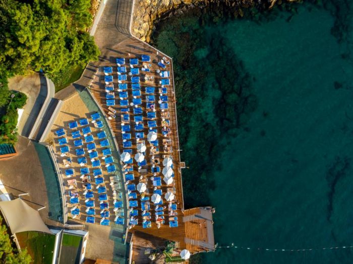Собствен – платформа на 3 нива. Чадъри, шезлонги и матраци на плажа и при басейна – безплатно. Плажни кърпи – безплатно.