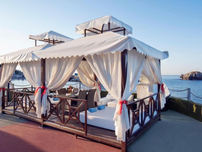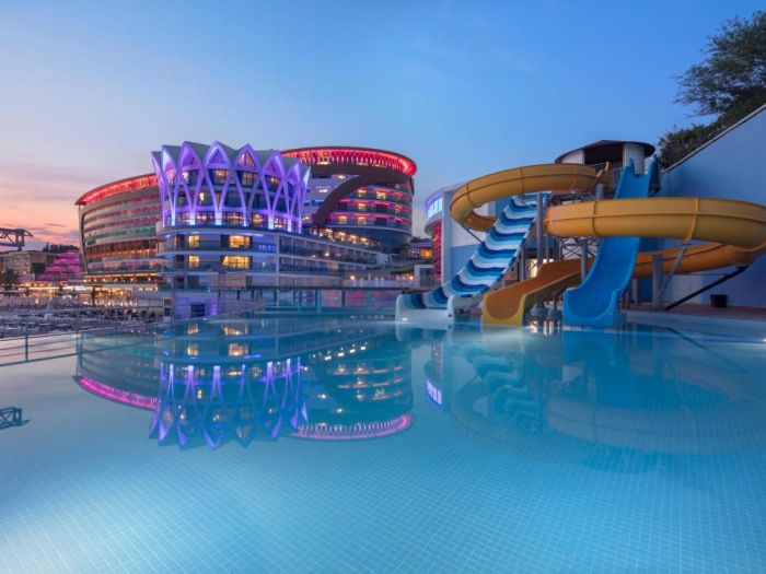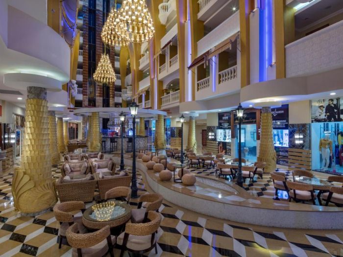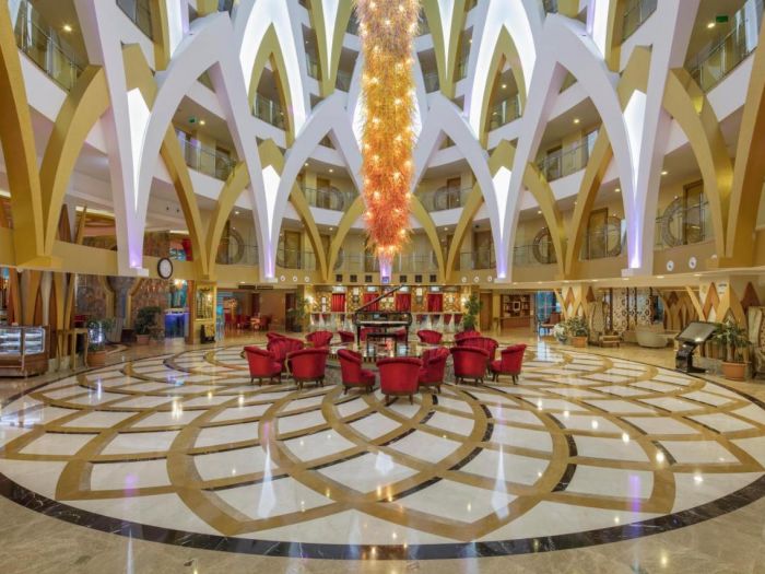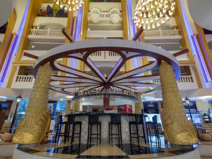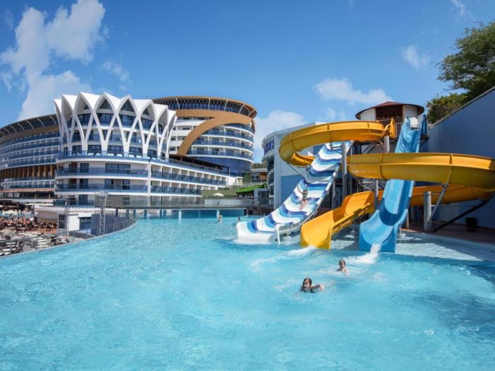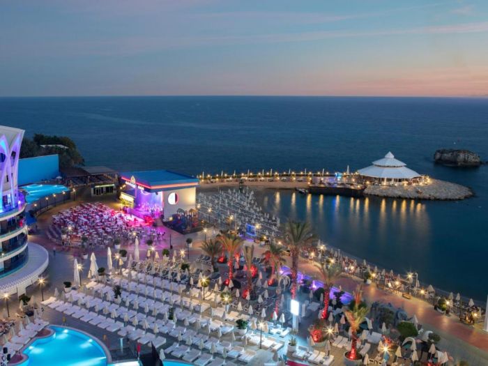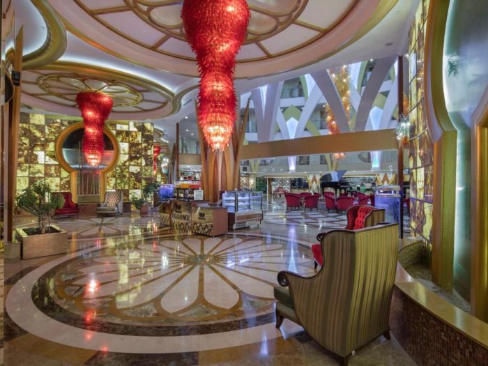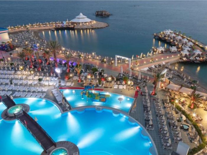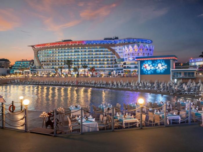 Основен ресторант, 6 а-ла-карт ресторанта (срещу заплащане), сладкарница, 7 бара, дискотека, 3 открити и 1 закрит басейн, 3 водни пързалки, СПА център, магазини, 2 конферентни зали. ЗА ДЕЦАТА: Открит и закрит детски басейн, мини клуб (4-12г.), детска анимация, мини кино, мини диско. БЕЗПЛАТНИ УСЛУГИ: Сауна, турска баня, парна баня, фитнес, аеробика, тенис на маса, 2 тенис корта, дартс, боча, анимация, жива музика, тематични партита, Wi-Fi (в Лоби). ПЛАТЕНИ УСЛУГИ: Масаж, пилинг, фризьор, химическо чистене, лекар, детегледачка, осветление за тенис корт, билярд, боулинг, наем на велосипеди, водни спортове, интернет кафе, рент - а кар. ПЛАЖ: Собствен, платформа (4500 m2). Чадъри, шезлонги и матраци на плажа и при басейна - безплатно. Плажни кърпи – срещу депозит.