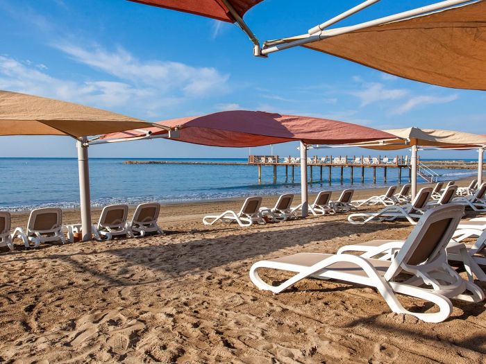 Собствен, пясъченo-чакълен. Чадъри и шезлонги на плажа и при басейна - безплатно. Плажни кърпи - безплатно.