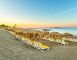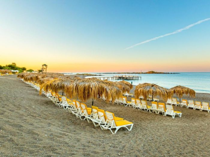 Собствен, пясъчно-чакълест с дължина на плажната ивица 350 м, платформа. Чадъри и шезлонги на плажа и при басейна - безплатно. Плажни кърпи – срещу депозит.