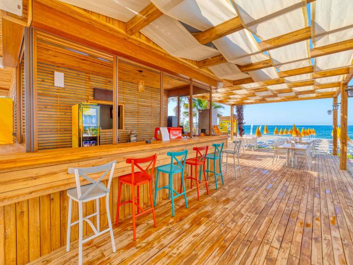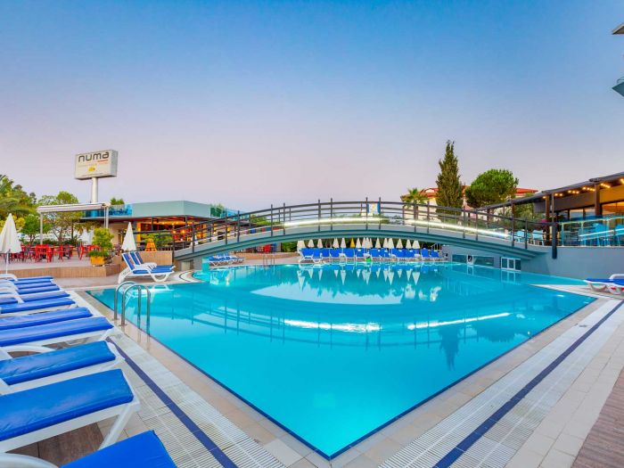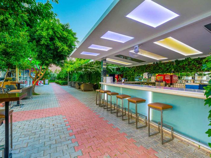 Основен ресторант, 2 снек ресторанта, сладкарница, 4 бара, 4 открити и 1 закрит басейн, 2 водни пързалки за възрастни и 3 за деца, СПА център.