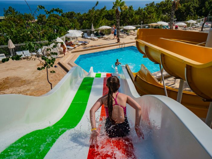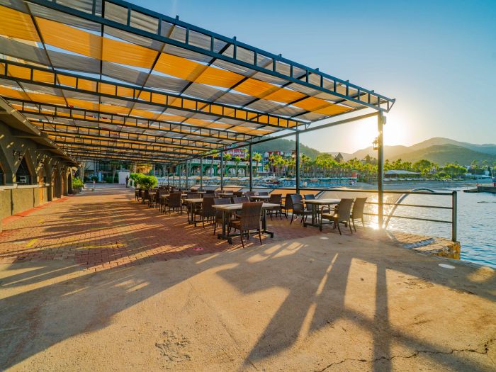 Основен ресторант, 1 а-ла-карт ресторант (рибен–1 безплатно посещение при минимум 7 нощувки), гьозлеме, снек ресторант, 7 бара, 2 открити басейна, водни пързалки, СПА център.