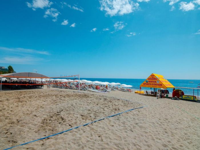 Собствен, пясъчно – чакълест на 150 м от хотела, чрез подлез. Чадъри, шезлонги и плажни кърпи на плажа и при басейна – безплатно.